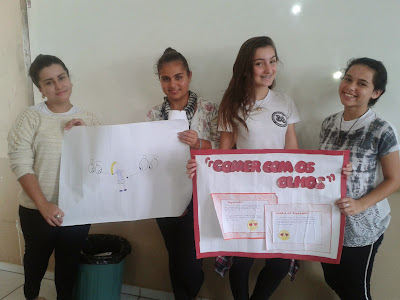 junto com a professora Francine confeccionaram cartazes ilustrados, com o